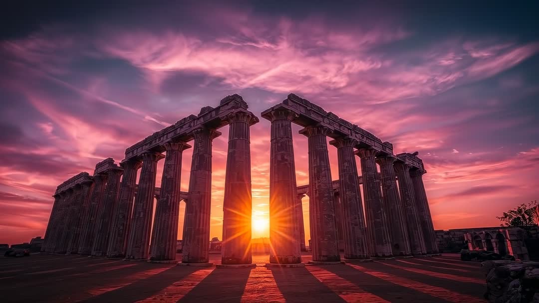 AI Generated Image. Video presenting sunburst aligning through ancient temple colonnade during golden hour, creating starburst flare and long dramatic shadows across carved stone floor. Color palette featuring deep magenta, warm orange, cool indigo, enhancing cinematic mood and sense of scale. Camera angle offering low perspective to emphasize towering columns and rhythmic arches while sun sliding toward horizon. Applications include travel and tourism promos, history and archaeology documentaries, cultural heritage features, website hero banners, social media reels, cinematic montages. Editing suggestions: use slow motion or timelapse to accentuate light change, add subtle lens flare for added drama, crop to 16:9 or vertical 9:16 for mobile platforms. Composition and color working well for backgrounds, posters, brochure covers, banner ads, and title sequences where mood and grandeur need conveying.