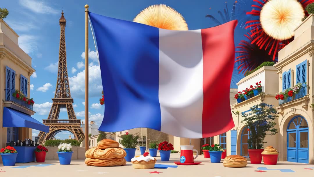 - French Flag Near Eiffel Tower with Festive Fireworks Display