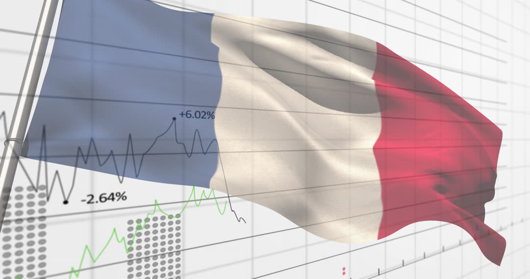 French flag prominently displayed in front of various economic graphs and data. Economic trends, stock market performance, and data analytics reflect national economic progress and potential. Ideal for use in contexts discussing French financial markets, economic policy, or socio-economic studies.