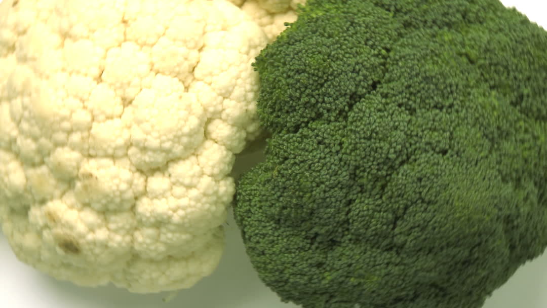 This video features fresh heads of cauliflower and broccoli placed side by side on a white background, highlighting their contrasting colors. Ideal for use in nutrition blogs, vegan recipe books, food magazines, and educational content about healthy eating and organic farming. Perfect for websites promoting vegetables and plant-based diets.