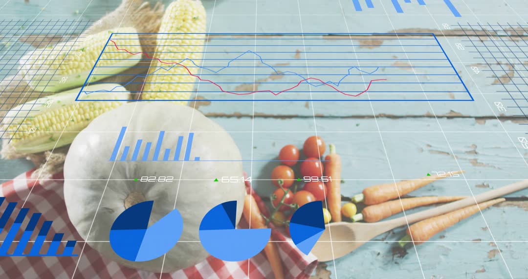 Visual intertwines fresh vegetables like corn, melons, and tomatoes with animated data overlays including bar charts and pie graphs, presenting relationship between farming and data analytics. Rustic wooden surface conveys country feel, promoting elements of agriculture and data usage in modern farming industry. Useful for agricultural technology presentations, marketing for organic products or educational content about healthy living with emphasis on data-driven methods.