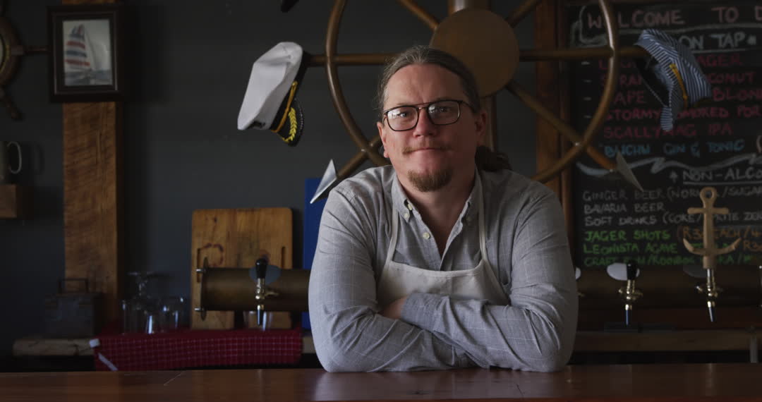 Friendly Barman Smiling in Microbrewery with Chalkboard Details Video