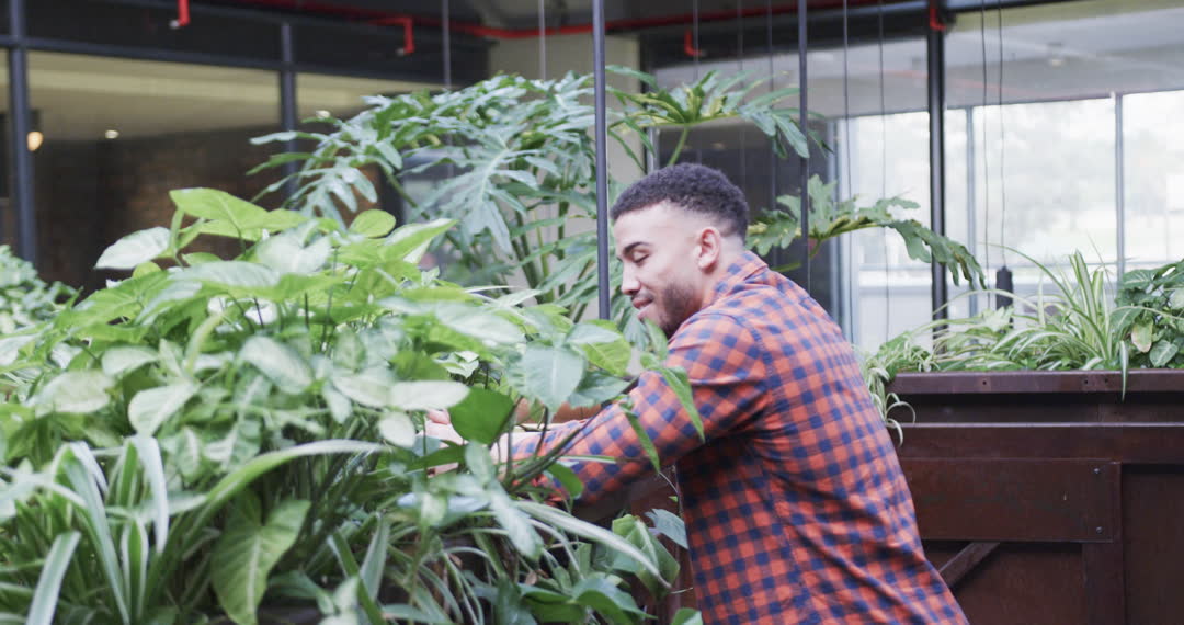 This scene shows a young businessman wearing a plaid shirt, exchanging a friendly greeting in a bright, plant-filled office space. His positive demeanor conveys warmth and friendliness, making the video suitable for content promoting team collaboration, modern office settings, or workplace culture enhancement. Useful for corporate websites, office supply marketing, or articles about employee well-being.