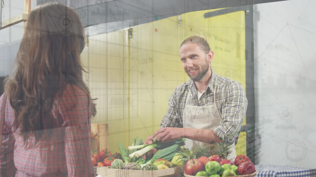 A scene of a friendly vendor helping a customer at a local market stall, filled with colorful and fresh produce. Overlaid with animated financial graphs, emphasizing the connection between local businesses and economic trends. Ideal for content on small business, sustainability, the economic impact of local markets, and consumer engagement.