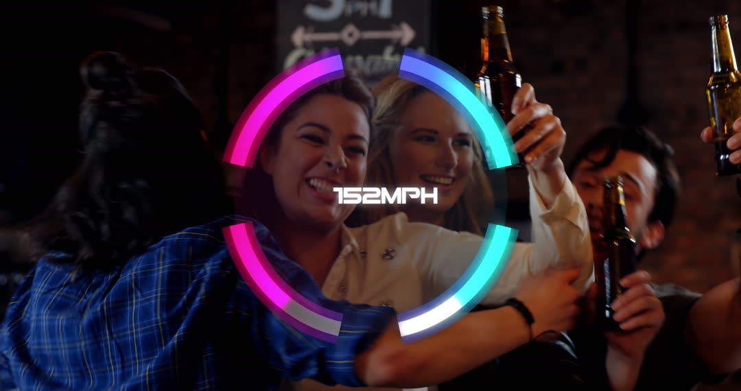 Friends gathering in a lively bar setting, holding drinks and celebrating together with smiles and cheers. Animation of a speedometer overlay suggests energy and excitement. Suitable for nightlife, celebration promotions, social events marketing, advertisements targeting young audiences, entertainment and lifestyle articles or content illustrating joy and community.