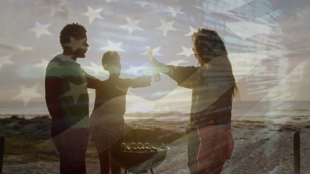 Friends Celebrating on Beach with USA Flag Overlay Video