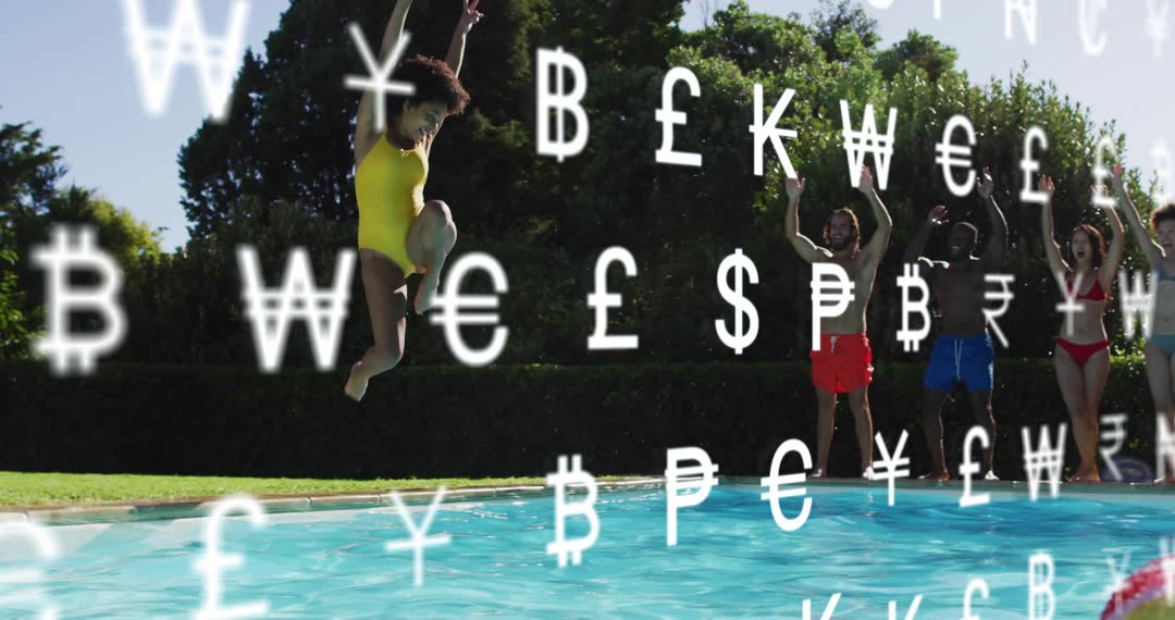Group of friends cheer as one jumps into a pool surrounded by global currency symbols floating visually through scene. Perfect for illustrating concepts of financial freedom and fun, such as having a travel or party budget, or enjoying leisure time without money worries. Great for adverts focused on travel, summer activities, and financial planning apps.