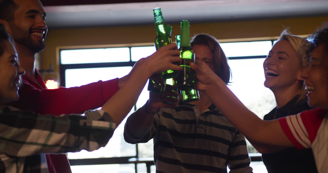 - Friends Celebrating with Toasting Beer Bottles in Pub