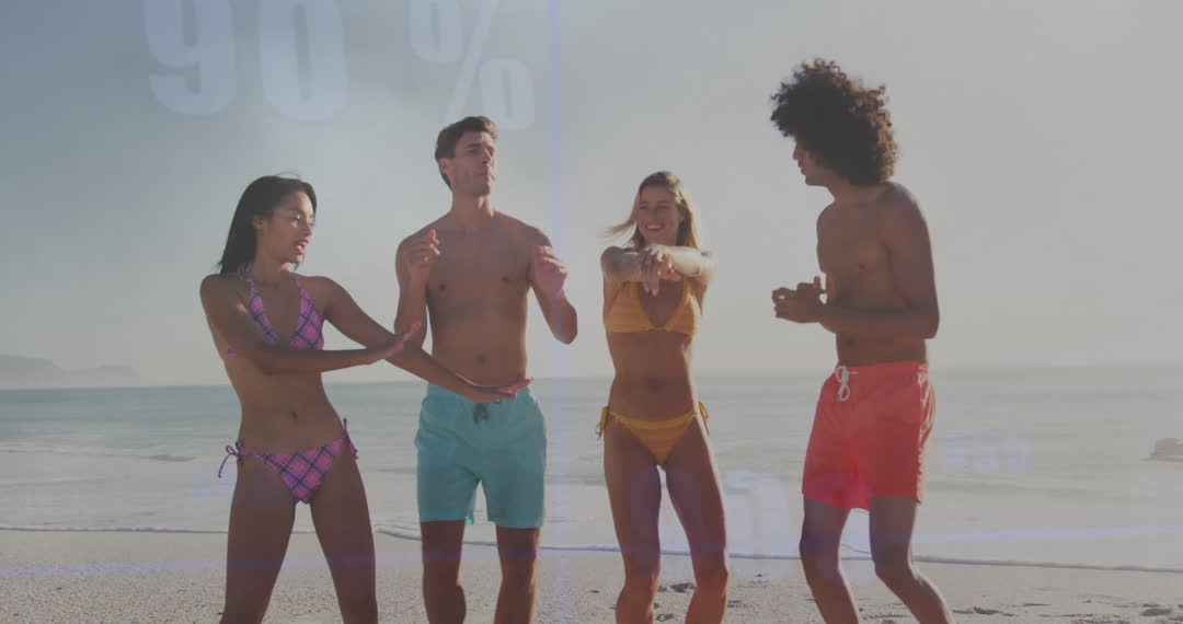 - Friends Dancing on Beach Overlayed with Financial Data Graphics