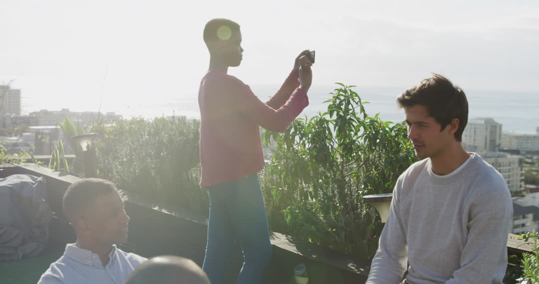 Group enjoying leisurely time on a rooftop with a panoramic city view. Biracial woman capturing the scenery, conveying a lively and relaxed community atmosphere. Suitable for content related to social gatherings, urban life, photography interest, or diverse friendships.