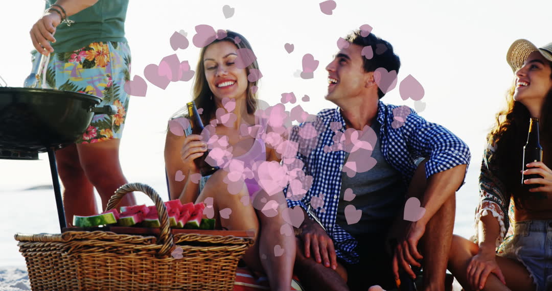 - Friends Enjoying Beach Picnic with Overlay Hearts Animation