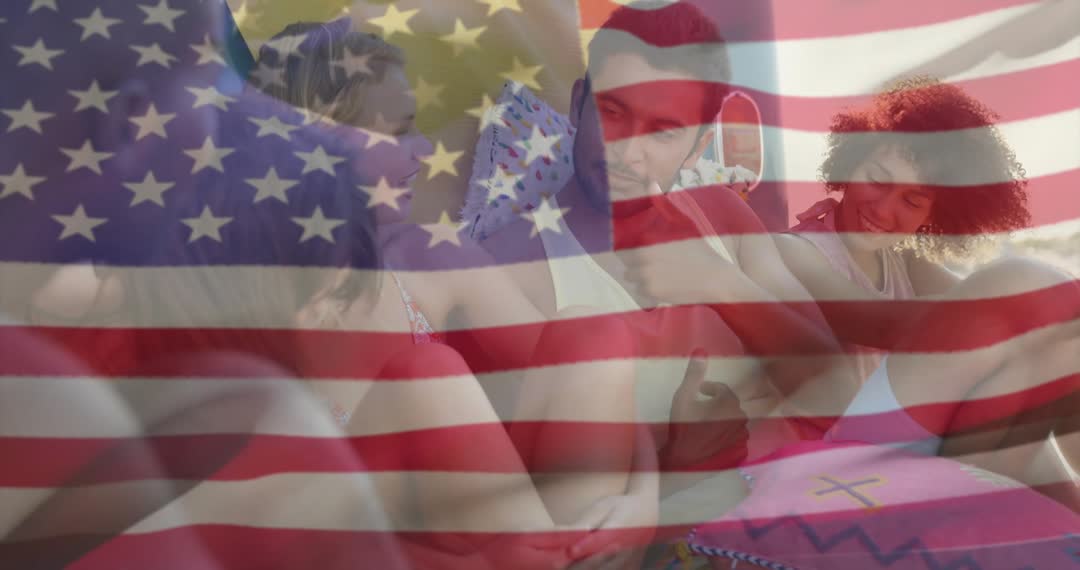 Young adults are enjoying each other's company in a camper van, representing friendship and travel. The overlay of the American flag symbolizes patriotism and adventure. Perfect for themes of relaxation, outdoor lifestyles, holidays, and American holidays or festive gatherings.