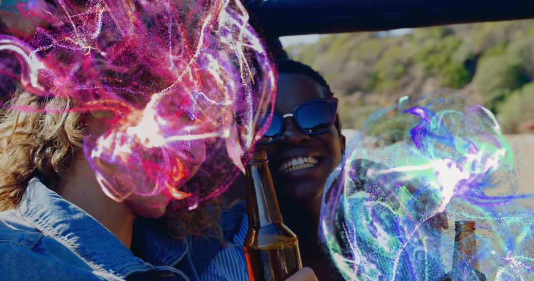 Friends sitting in a convertible against a scenic coast road backdrop, holding beer bottles, while surrounded by colorful digital neon swirls. The video captures the essence of adventure, leisure, and camaraderie, emphasizing a moment of relaxation and fun. Neon overlays give a futuristic and artistic touch, making it suitable for digital art projects, travel websites, and lifestyle advertising. A perfect representation for campaigns focusing on social gatherings, summer road trips, or products related to leisure and technologies providing amazing visual effects.