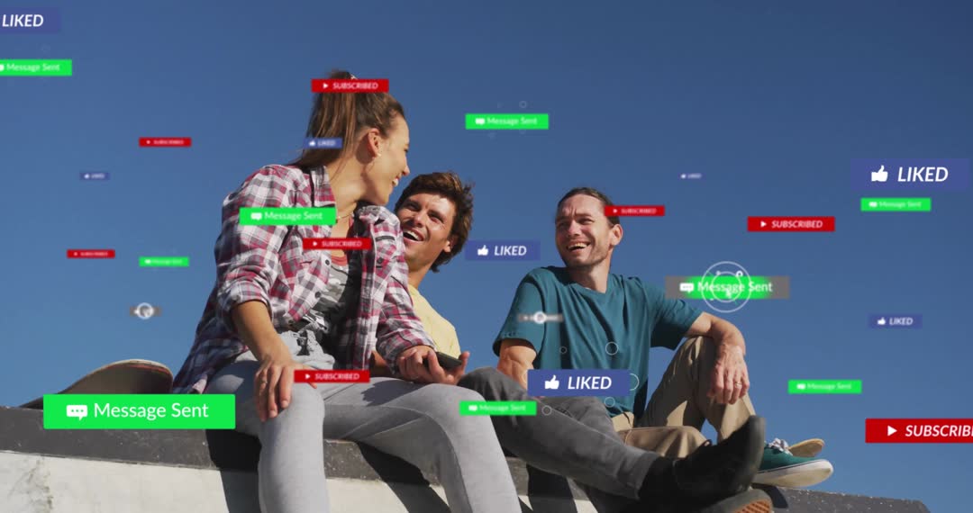 Young men and women sitting on skatepark edge engaged with mobile phones, surrounded by vibrant social media icons like 'Message Sent', and 'Liked'. Depicts modern technology use in recreational settings, highlighting connectivity and urban youth culture. Ideal for illustrating articles on digital interaction, social networks influence, or technology trends in everyday life.