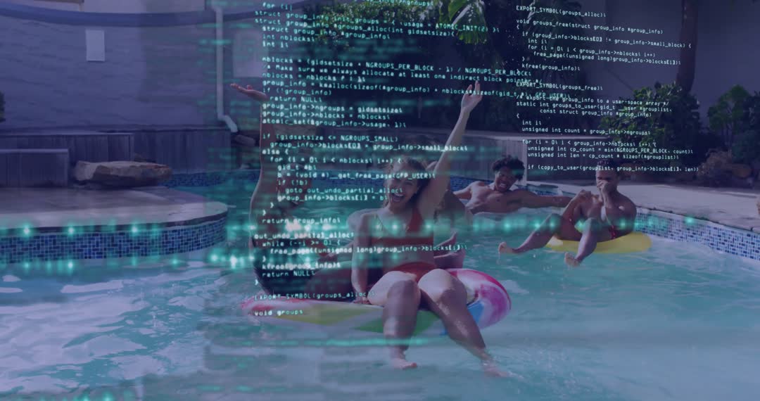 Friends Enjoying Time in Pool with Digital Overlay of Tech Code Video