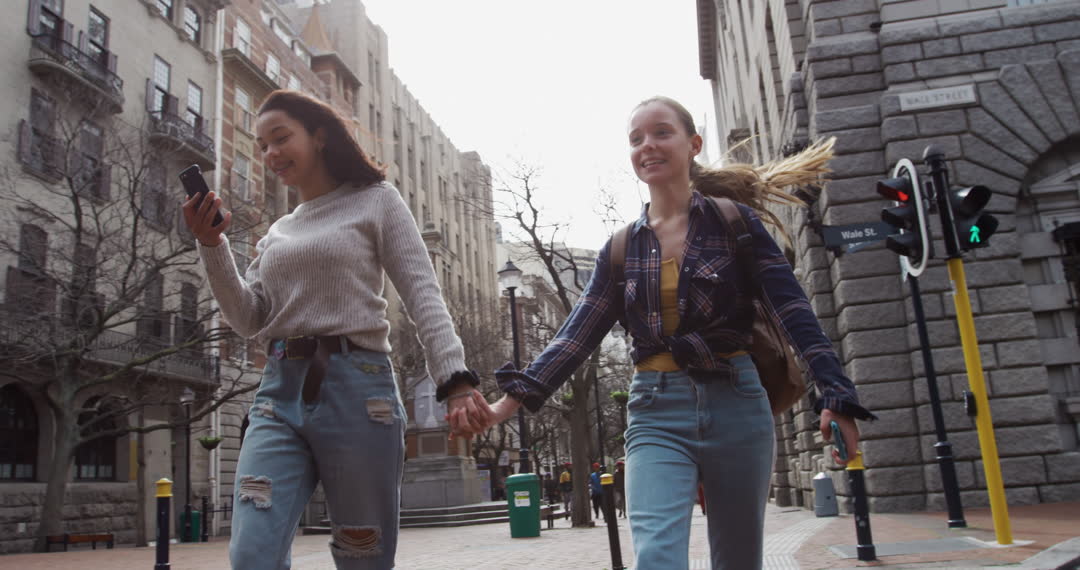 Two young women joyfully walking hand in hand down city streets, embodying friendship and leisure. Ideal for representing diversity, friendship, positive lifestyle, and urban exploration in various media like blog posts, travel articles, or social media content promoting friendship or urban living.