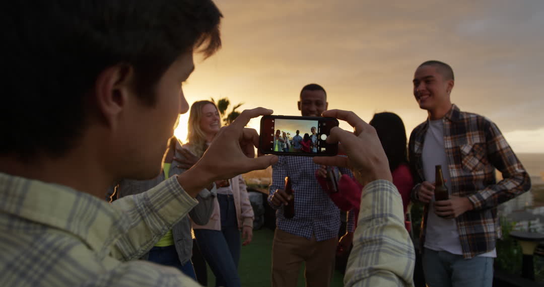 A diverse group of friends enjoys an evening gathering on a rooftop terrace, capturing moments with a smartphone. This video captures a sense of camaraderie and happiness, perfect for promoting social gatherings, lifestyle features, or articles related to youth culture and urban living.