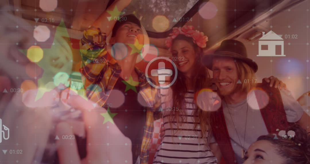 Young friends joyfully celebrate together as digital connection elements blend into their environment, depicting a mix of social media influence and networking in a relaxed atmosphere. This video perfectly illustrates themes of connectivity, communal fun, and the ubiquitous presence of digital interfaces in social gatherings. Ideal for campaigns focusing on social media integration, youth events, or technology's role in modern relationships.