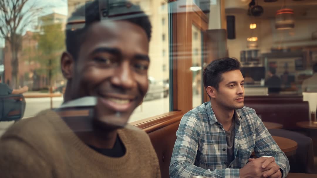 AI Generated Image. Two friends enjoy a moment captured through a cafe window. One man, wearing a knit sweater, smiles warmly at his companion over mugs, set in a soft-lit urban interior. The setting aga emphasizes a relaxed and sociable environment. Ideal for promoting themes of friendship, casual lifestyle, or urban living. Perfect for advertisements or social campaigns focusing on connection and warmth.