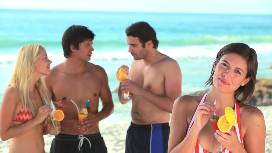 - Friends Relaxing with Refreshing Drinks on Sunny Beach