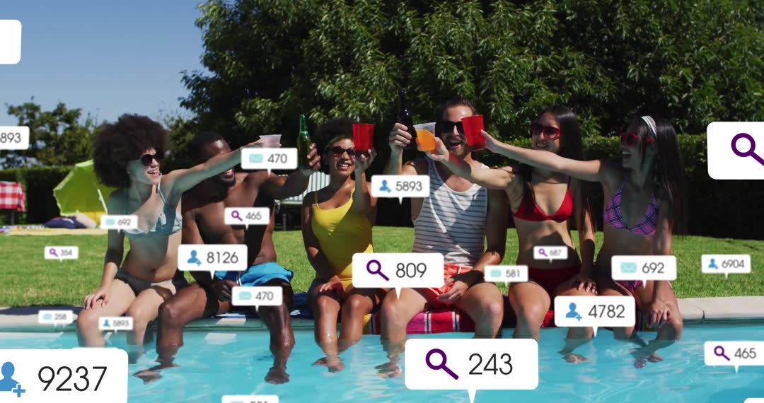 Group of young friends socializing by pool lifts drinks to make a toast. Overlapping animations portray social media interactions like likes and follows. Ideal for content on social interactions, digital marketing, internet culture.