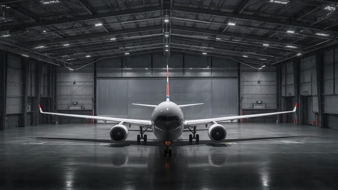 AI Generated Image. Video showing frontal view of wide-body twin-engine jet sitting inside dim industrial hangar. Lighting shifting across fuselage and wings, creating stark reflections on polished concrete floor. Nose landing lights appearing and casting warm glow, emphasizing symmetry of aircraft silhouette and engine nacelles. Composition centering on nose, landing gear and winglets to highlight scale and engineering detail. Camera holding steady with option for slow pushback or subtle dolly to reveal hangar breadth and structural grid. Color palette featuring cool grays with selective red accents on tail and wingtips, creating cinematic, moody atmosphere. Use cases include aviation marketing, airline corporate video, hangar tour sequence, maintenance safety presentation, background footage for aerospace documentary, hero clip for aircraft leasing or manufacturing promotion. Production tips: pair with bold headline and short tagline, apply gentle color grading to increase contrast, crop for vertical social media formats, add ambient low-frequency sound design to enhance cinematic impact.