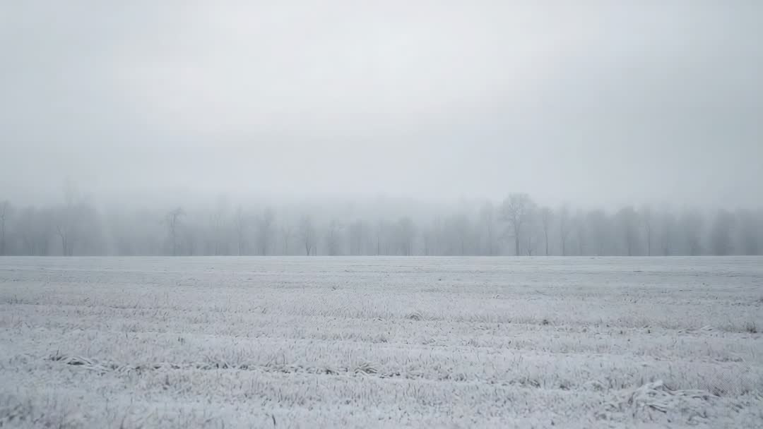 - Frost-Covered Field Transitioning to Thick Fog over Distant Treeline - Winter Time-Lapse
