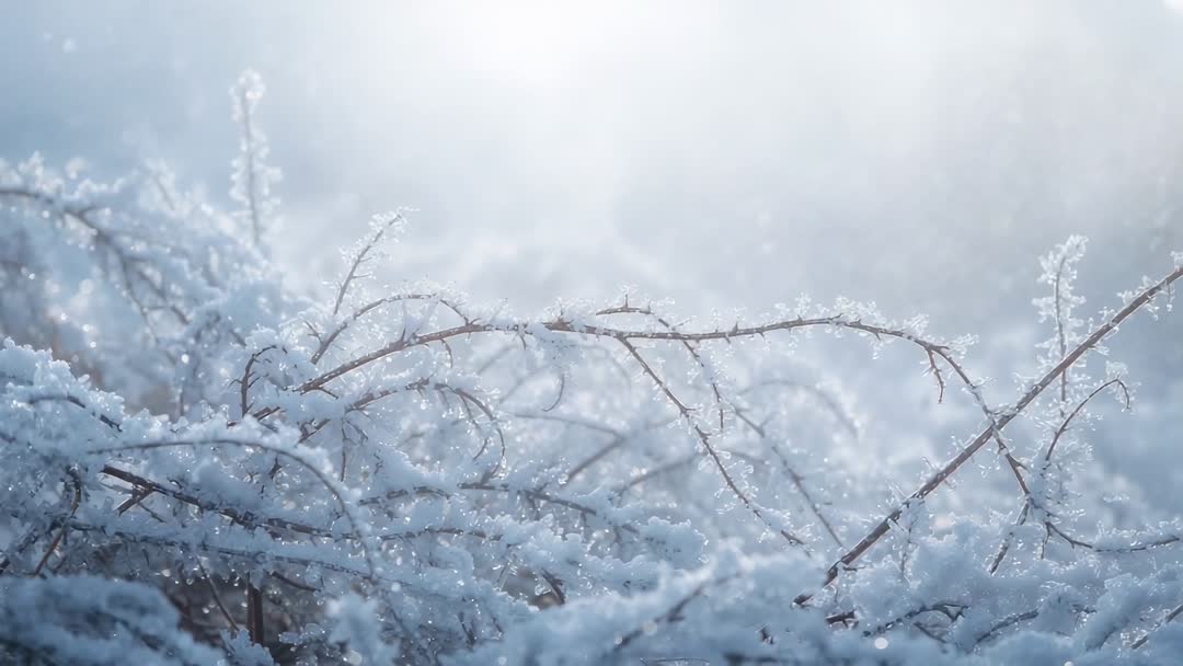 AI Generated Video. Clip showing frost-covered twigs sparkling and catching sunrise light, with drifting ice crystals producing soft bokeh and shimmering highlights. Shallow depth of field and close-up framing emphasizing texture of hoarfrost and delicate branch forms. Cool blue tones and airy backlight creating tranquil, crisp winter mood. Footage working well for seasonal commercials, holiday greeting videos, nature documentaries, social media reels, website hero backgrounds, product ads for cold weather apparel, mindfulness and relaxation app backgrounds, cinematic title sequences. Flexible for slow motion edits, loopable background clips, layered overlays in video projects. Useful for editorial use in environmental stories, travel features, lifestyle articles focusing on quiet winter mornings.