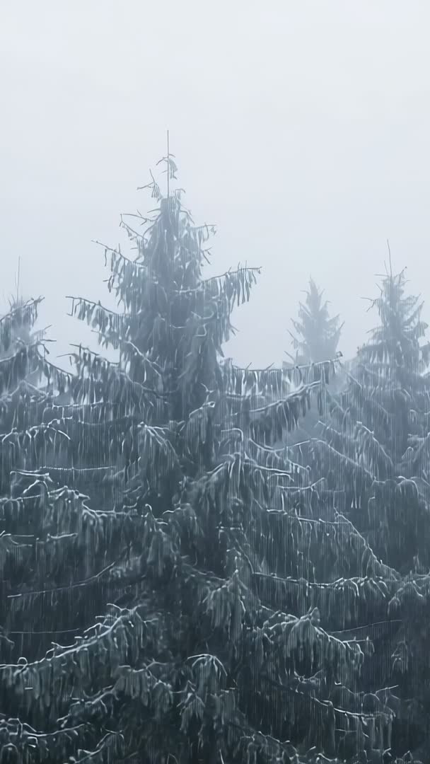 - Frosted fir forest swaying in heavy mist vertical video for winter nature background