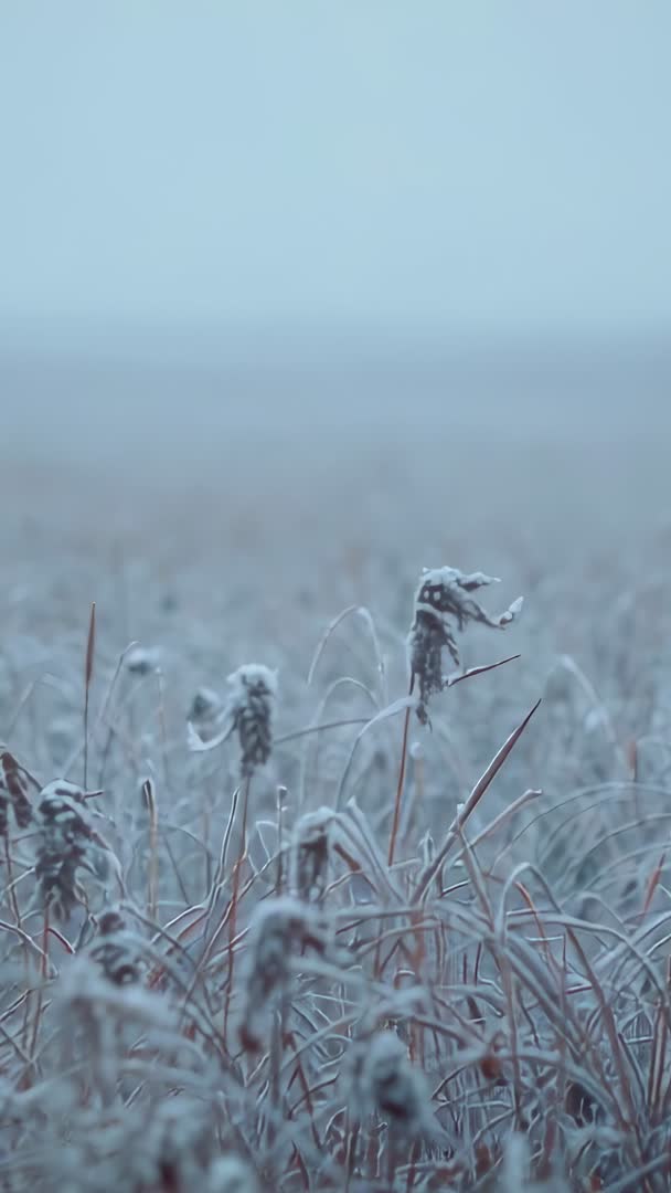 AI Generated Video. Vertical slow-motion clip capturing frosted meadow grasses swaying in gentle breeze and low mist, with seed heads bending and settling under icy coating. Empty upper frame providing space for title or text overlay and creating strong vertical composition for mobile screens. Ideal for using as background for winter-themed social media reels, Instagram Stories, TikTok, or vertical ad campaigns. Useful for adding calm, cold, cinematic mood to nature documentaries, mindfulness apps, website hero banners, and seasonal product promos. Suggestions for use: looping clip for ambient background, pairing with soft wind or piano audio, color grading toward cooler blue tones, and cropping for portrait-first platforms. Suitable for editors needing subtle motion B-roll, seasonal transitions, or minimalist environmental visuals.