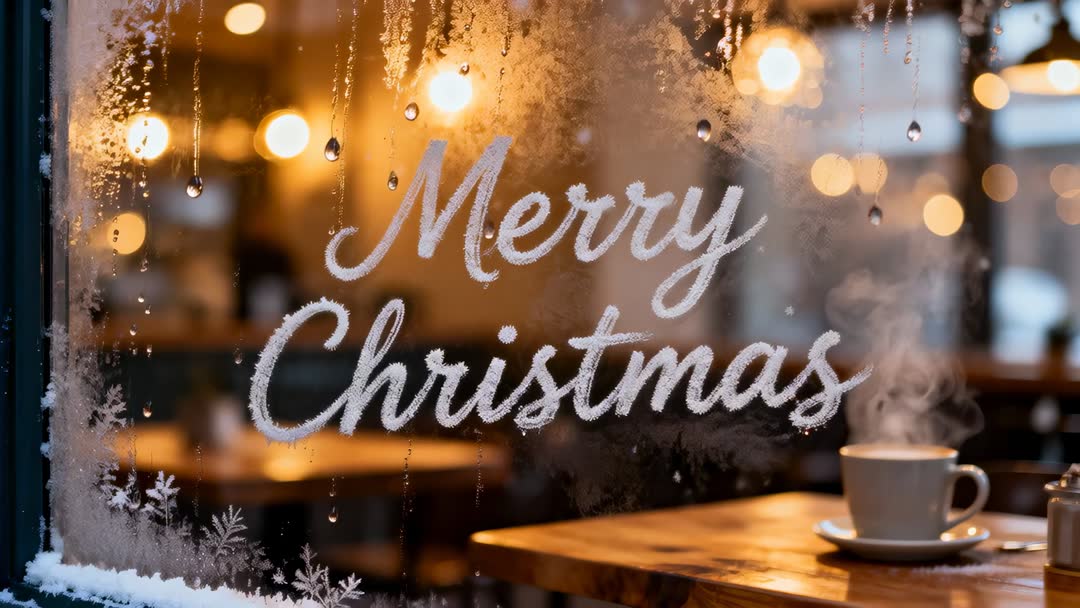 AI Generated Video. Clip showing frosted Merry Christmas lettering on cafe window with water droplets gliding down glass, warm bokeh lights glowing inside, steam rising from mug on wooden table. Mood conveying cozy winter atmosphere and seasonal comfort. Composition offering tight foreground details with softly blurred interior background for copy placement. Ideal for holiday marketing, cafe and coffee shop promotions, seasonal social media posts, greeting card animations, online banners, storefront displays, background loops for in-store digital signage. Color palette featuring warm ambers and cool frosty blues for contrast. File usable for advertising campaigns, blog headers, video intros, lifestyle projects, and festive stock footage libraries.