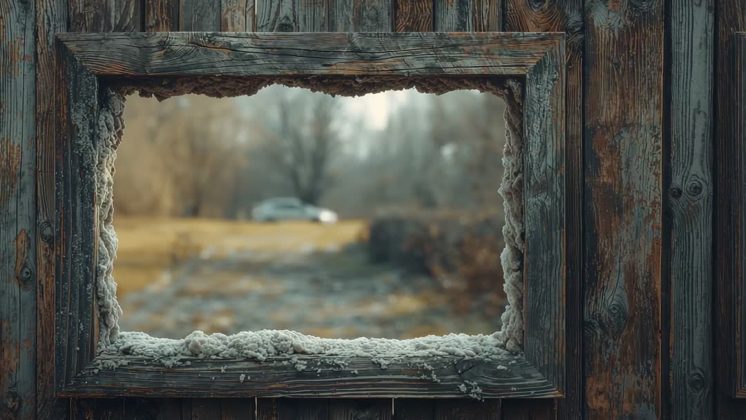 AI Generated Video. Panning through frosty window frames picturesque winter scene outside an aged, rustic shed. Use video for capturing tranquil nature views, emphasizing textures of weathered wood and frost, ideal for backgrounds in seasonal promotions or artistic projects.