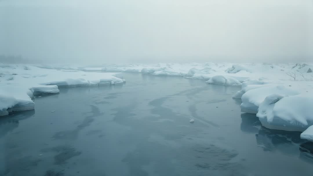 AI Generated Image. Video captures a serene Arctic winter scene featuring partially frozen water with drifting ice floes amidst snow-covered banks. The atmosphere is calm, enveloped in mist, creating an ethereal wilderness environment. Ideal for content related to nature, winter tranquility, climate studies, or environmental documentaries.