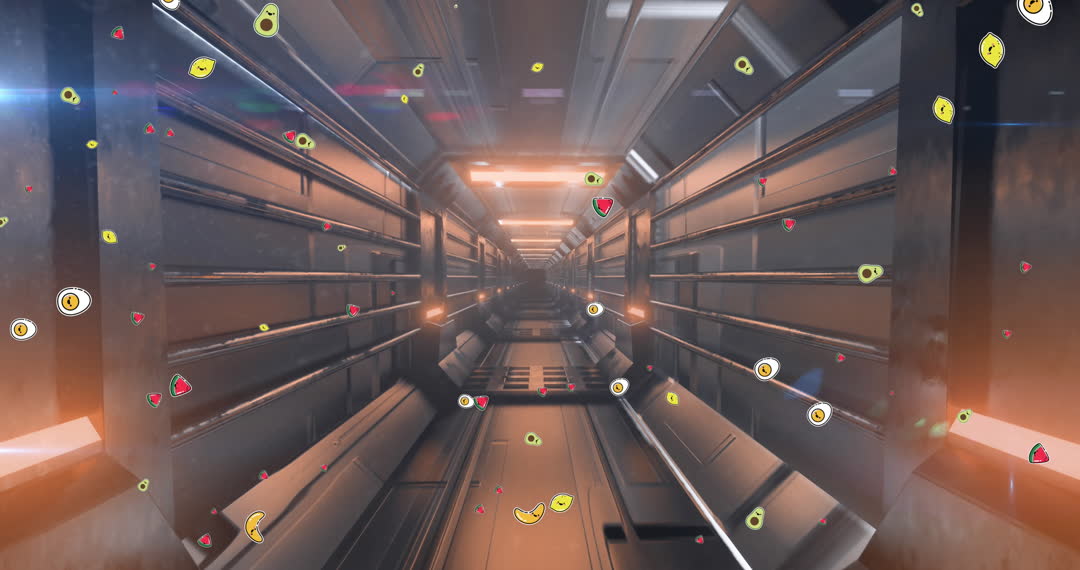 Vibrant animation depicts various fruits falling through a futuristic industrial tunnel, combining motion and vivid digital artistry. Multicolored fruit decals add leverage with abstract movement, suggesting a modern and lively essence. Useful in digital art projects, creative food advertising, or innovative tech presentations featuring unique contrasts of nature and industry.