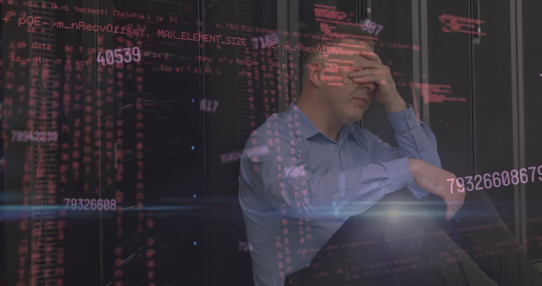 Male professional siting in server room, overwhelmed by technical difficulties with digital codes visible around him symbolizes stress and frustration in cybersecurity or data management fields. Ideal for demonstrations of cybersecurity pitfalls, technical support marketing materials, or articles on IT job challenges.