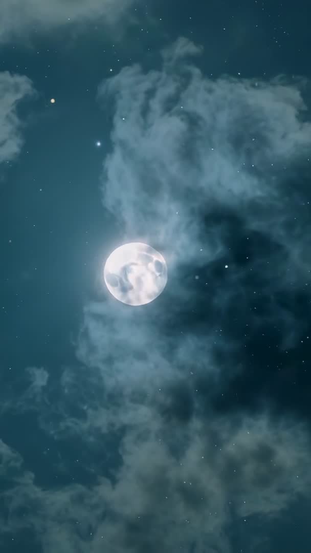 AI Generated Image. Vertical video showing full moon emerging from drifting clouds against deep starry sky. Moon glowing with soft halo, wispy clouds rolling across frame, creating slow cinematic motion and moody atmosphere. Tiny stars sparkling in background, subtle blue-green color grading adding dreamy nocturnal tone. Footage working well as background for music visuals, title sequences, Instagram and TikTok stories, meditation and sleep apps, nature and astronomy content, Halloween and fantasy promos. Loop-friendly composition and calm pacing making footage suitable for relaxation videos, social posts, app splash screens, website hero banners, broadcast lower thirds. Color grade and contrast providing easy integration with text overlays and slow motion edits.