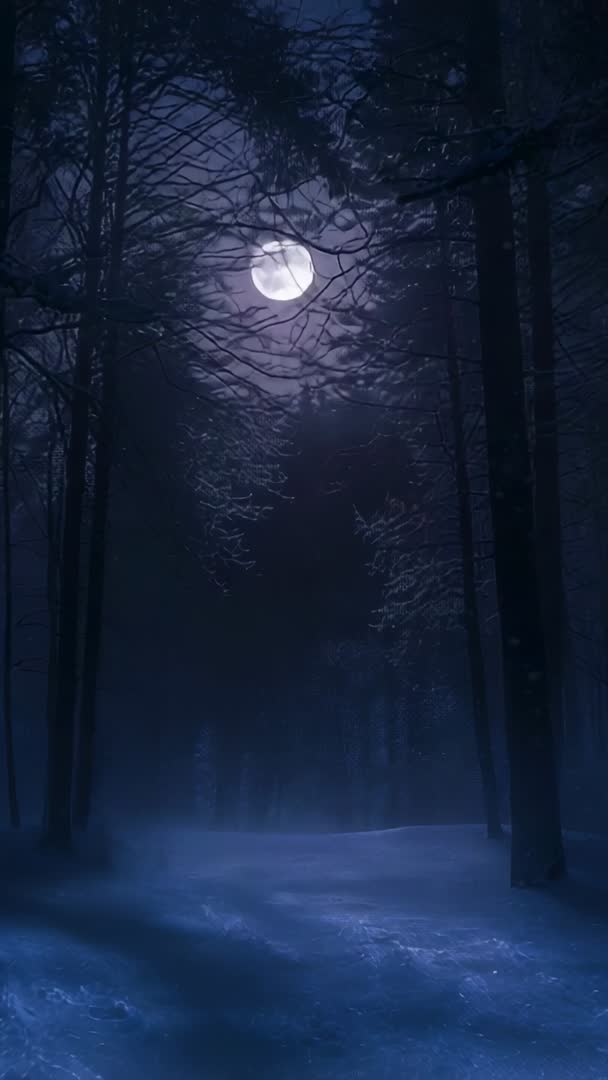 AI Generated Video. Vertical video showing full moon glowing through swaying branches above snow-covered path, mist drifting among tall trunks. Moonlight casting soft blue glow across snow, revealing long tree silhouettes. Branches shifting in gentle breeze, snowflakes swirling and low mist hugging ground. Mood conveying quiet, mysterious atmosphere for cinematic storytelling and atmospheric scenes. Suggested uses include film opener, horror and mystery trailers, ambient music background, meditation videos, social media Stories and Reels, app and website hero backgrounds, seasonal holiday campaigns, book cover motion design, mobile wallpapers, background for voiceover narration or ASMR content. Vertical aspect optimized for mobile platforms, loopable for seamless playback, color grading friendly for enhanced blue or moody tones.