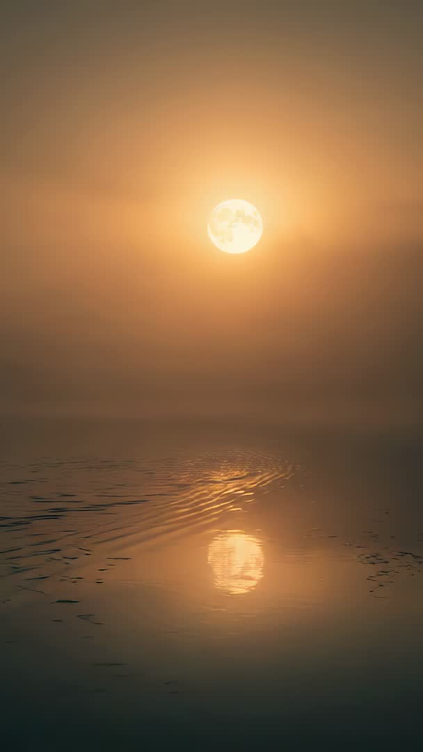 AI Generated Image. Showing full moon reflecting on misty lake surface with slow-moving ripples and glowing halo. Offering calm, atmospheric vertical footage for meditation, relaxation, background loops, social media stories, mobile backgrounds, and cinematic title sequences. Featuring warm golden tones, soft haze, and minimal motion for seamless looping and long-duration playback. Serving nature channels, wellness apps, sleep aid videos, ambient music backgrounds, and travel marketing. Providing 9:16 vertical orientation, high-resolution, gentle motion, and unobtrusive visual space for text overlays and lower-thirds.