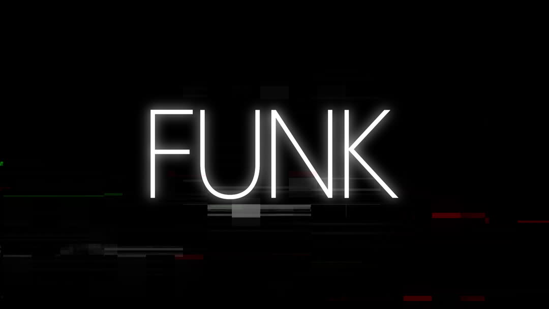 White text displaying 'FUNK' appears dynamic against digital glitches and interference patterns on black. Great for projects involving music, urban themes, or modern digital concepts. Useful for social media posts, posters, or electronic music advertising.