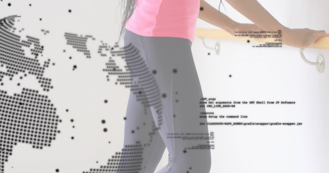 This video frame features an intriguing blend of fitness and technology, where an individual grips a barre for exercise amidst a digital backdrop of floating code and a fading globe. Ideal for projects on modern fitness innovations, digital impact on physical health, or motivational content that ties technology with exercise routines. The minimalistic yet artistic fusion can visually enhance articles or presentations about dance workouts, fitness technology advancements, or inspiring new-age exercise classes.