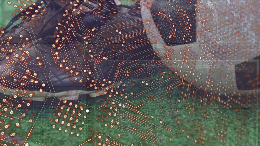 Abstract digital circuit pattern overlays soccer ball video, illustrating the intersection of soccer and technology. This visual can be ideal for promoting articles, blogs, or presentations focused on technological advancements in sports, data analytics in athlete performance, or the integration of digital tools in sports management and strategy.