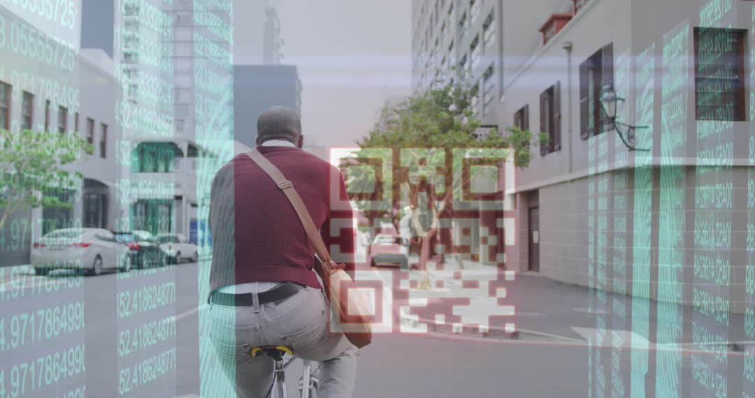 This visual depicts a futuristic theme combining traditional urban cycling with digital overlays, such as QR codes and data analytics, emphasizing eco-friendly commuting in an urban environment. It can be used for conveying concepts related to sustainability, smart city solutions, modern transport innovations, and tech-driven lifestyle choices. Great for presentations about sustainable urban development, smart technologies in public transport, or environmental impact discussions.
