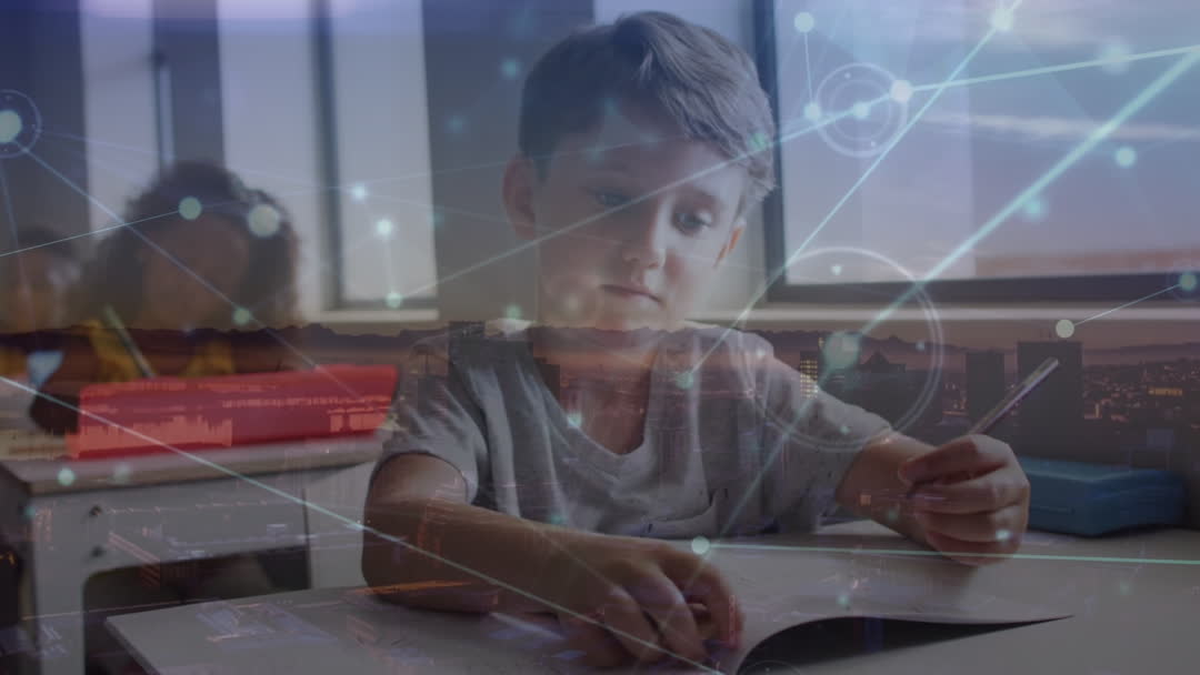 This video depicts a young boy studying in a classroom while digital network connections overlay the scene, symbolizing the integration of technology in modern education. It is ideal for illustrating articles on technological advancements in education, e-learning platforms, or the future of classrooms, and can be used in education technology presentations or marketing materials.