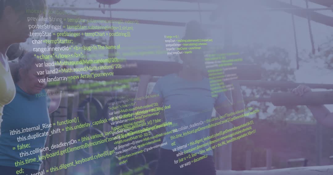 This visual showcases the intersection of fitness and technology, featuring computer code layered over a person engaging with gym equipment. Ideal for illustrating the concept of cutting-edge innovation in the health and sports industries. Suitable for use in articles or presentations dealing with fitness app development, modern gym technology, or smart workout solutions. Emphasizes the trend of digital transformation in physical fitness.