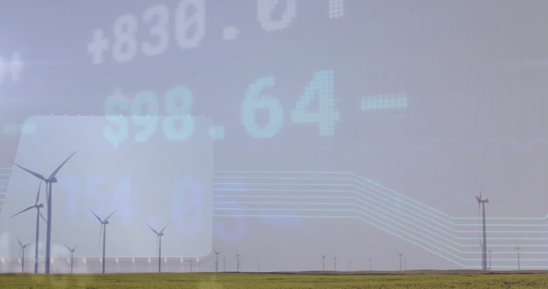 Overlay of financial data and wind turbines in a field suggests connectivity between sustainable energy solutions and digital financial technologies. Ideal for illustrating themes of eco-friendly business practices, the integration of green technology with data-focused innovation, or the concept of smart, sustainable finance.