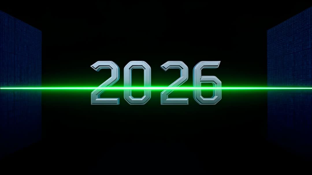 - Futuristic 2026 Metallic Numerals Glowing, Green Laser Beam Cutting Through Center