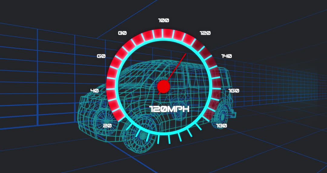 Abstract rendering depicts futuristic automotive technology showcasing a vehicle in a detailed 3D wireframe model alongside a prominent speedometer pointing to 120 MPH. Potential uses include conceptual design presentations, automotive innovation illustrations, and educational materials on vehicular speed assessment.