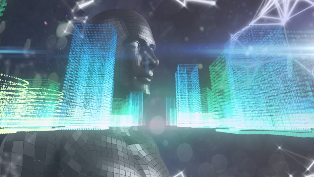 This video portrays a futuristic scene with a digital 3D model of a cityscape alongside a human figure representation, symbolizing the integration of technology and human connection. Ideal for illustrating concepts of advanced technology, smart cities, architectural innovation, medical research, and futuristic environments. Suitable for use in promotional materials, websites, and articles related to technology, urban planning, and digital advancements.