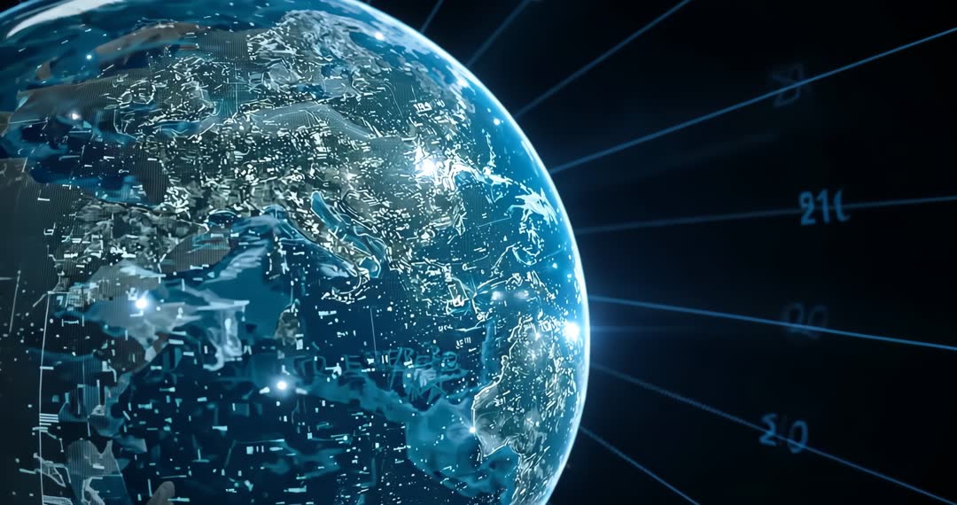 Futuristic 3D Earth Rotating with Beam and Numeric Overlays Video