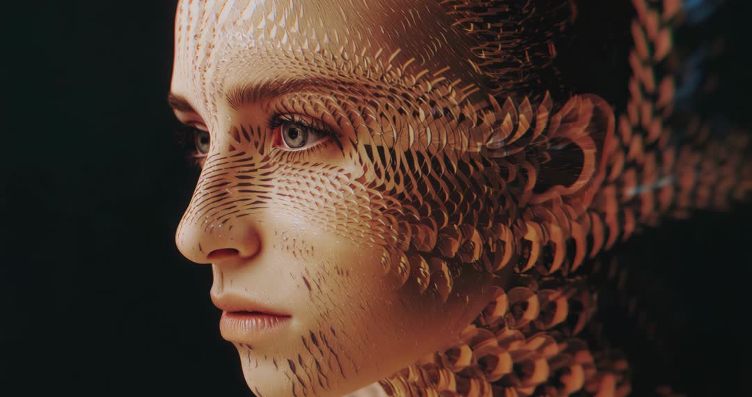 AI Generated Image. 3D head model displays glistening metallic scales seamlessly transforming, set against dark backdrop creating high contrast. Ideal for illustrating the themes of future technologies, digital design, artificial intelligence, and avant-garde aesthetics. Suitable for use in articles about technological advancement, innovative design in virtual worlds initial launch announcements and inspirational art discussions.